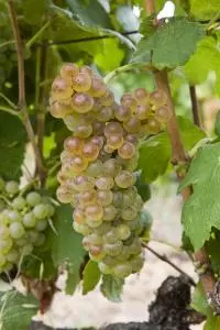 Grappes moyennes, baies rondes adoptant une couleur rousse-dorée à maturité.